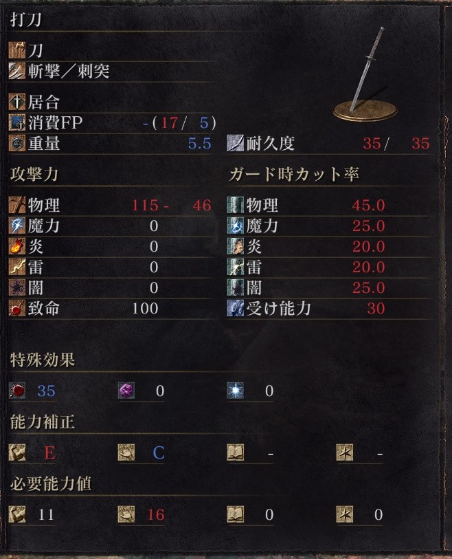 最序盤で入手できるうえに他の刀と比べても優秀。出血も狙える。